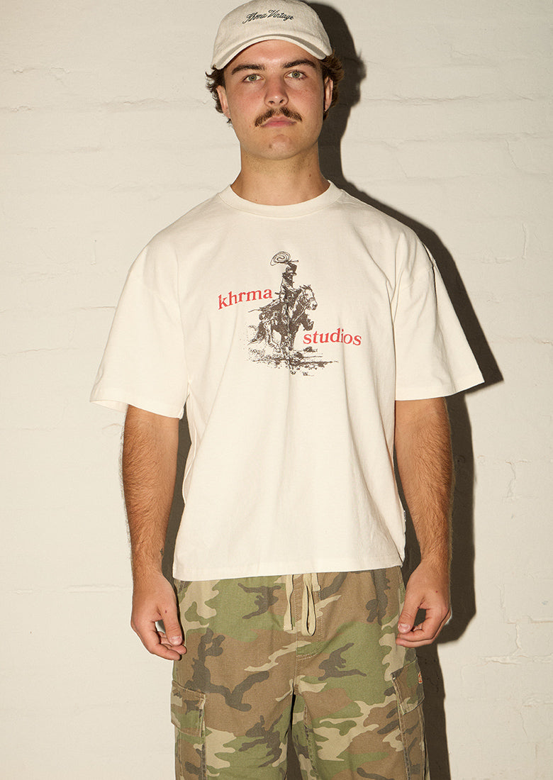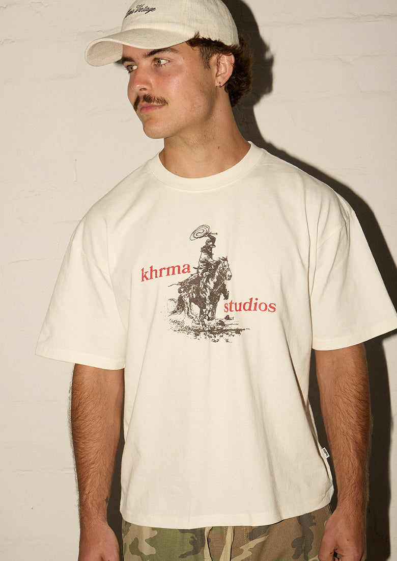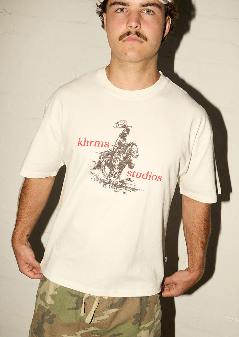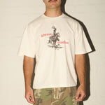 Make a bold statement with the Chopped No Mercy - Blazing Saddles in Off White. This oversized boxy fit tee features a hand printed Khrma cowboy on a horse design. Perfect for those who live on the edge and want their style to reflect it.