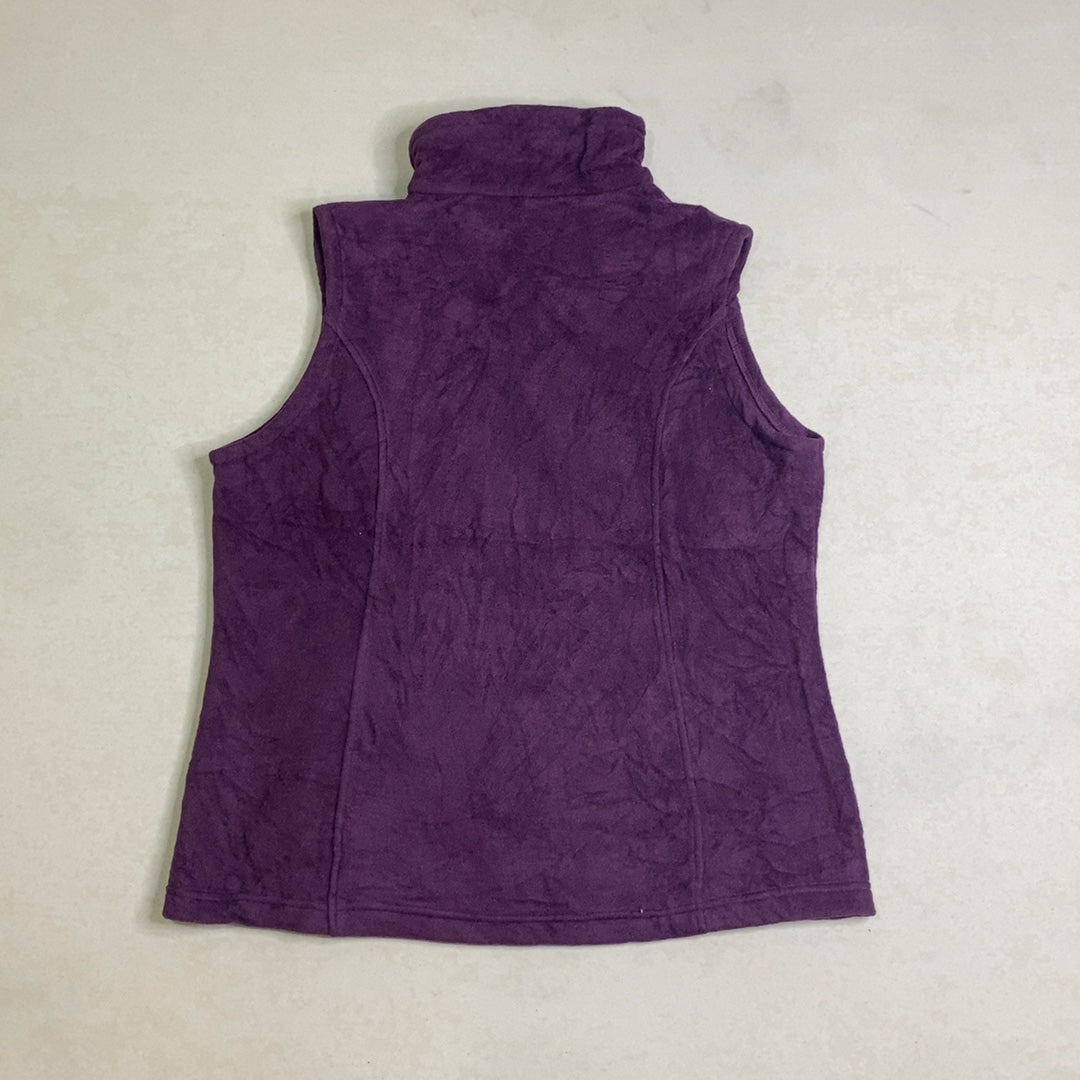 Purple Columbia fleece vest with full-zip front, mock neck collar, and two zip hand pockets; clean minimalist outdoor look with small chest brand patch and contoured seam panels for shape.