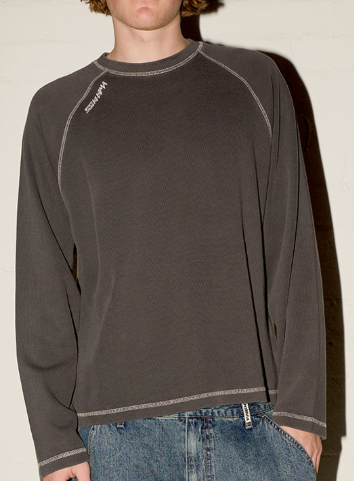 The Contrast Raglan LS Tee in Washed Black features a bold waffle texture and a relaxed fit that effortlessly combines comfort with standout style. Its unique fabric adds depth, while the raglan sleeves create a dynamic silhouette perfect for those who dare to be different. Elevate your casual wardrobe with this edgy yet laid back essential.