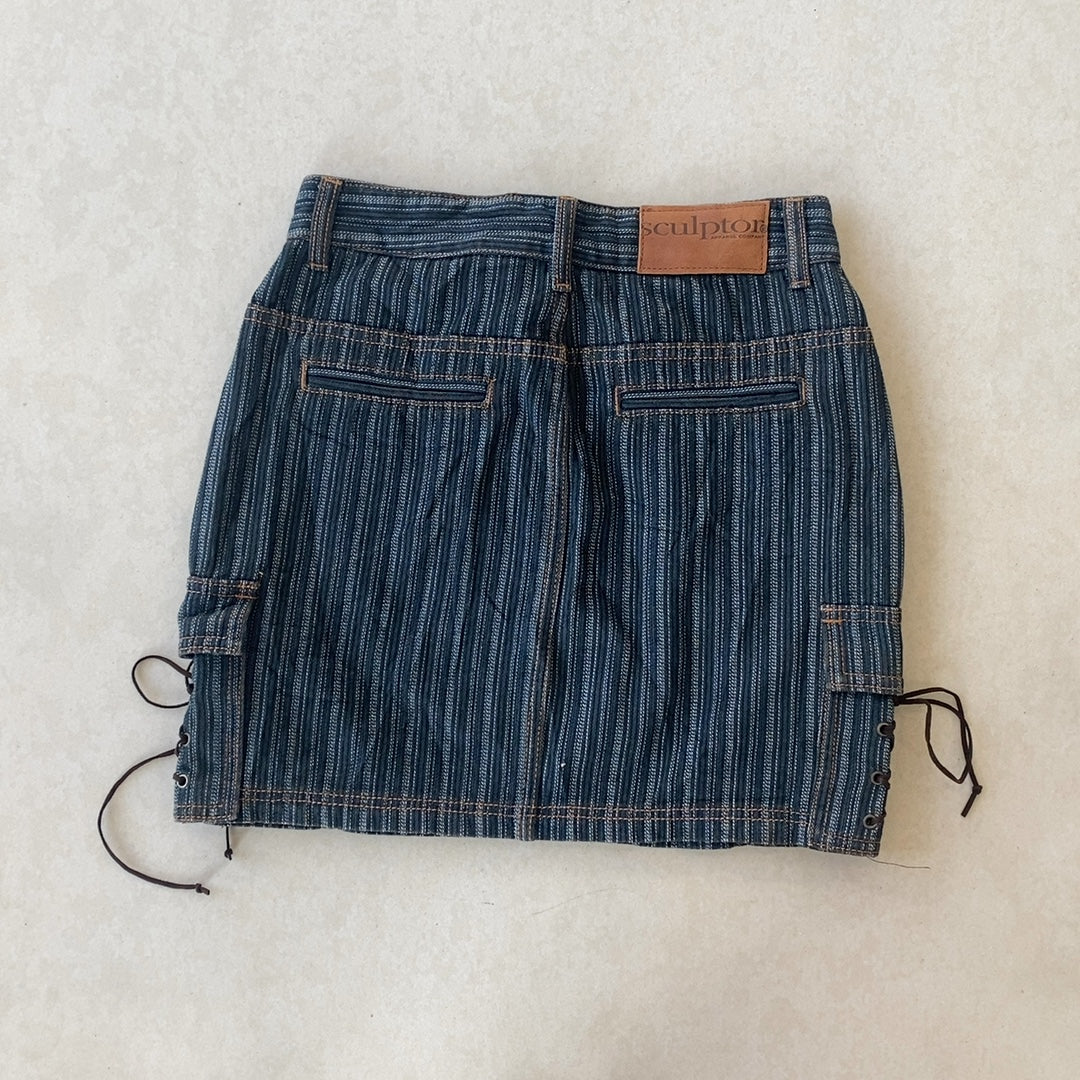 Blue vertically striped denim mini skirt with contrast brown topstitching; front button-and-zip closure, belt loops, scoop front pockets with rivet detailing, back welt pockets, and lace-up side panels with grommets and long ties; branded back leather patch and small front logo tab.