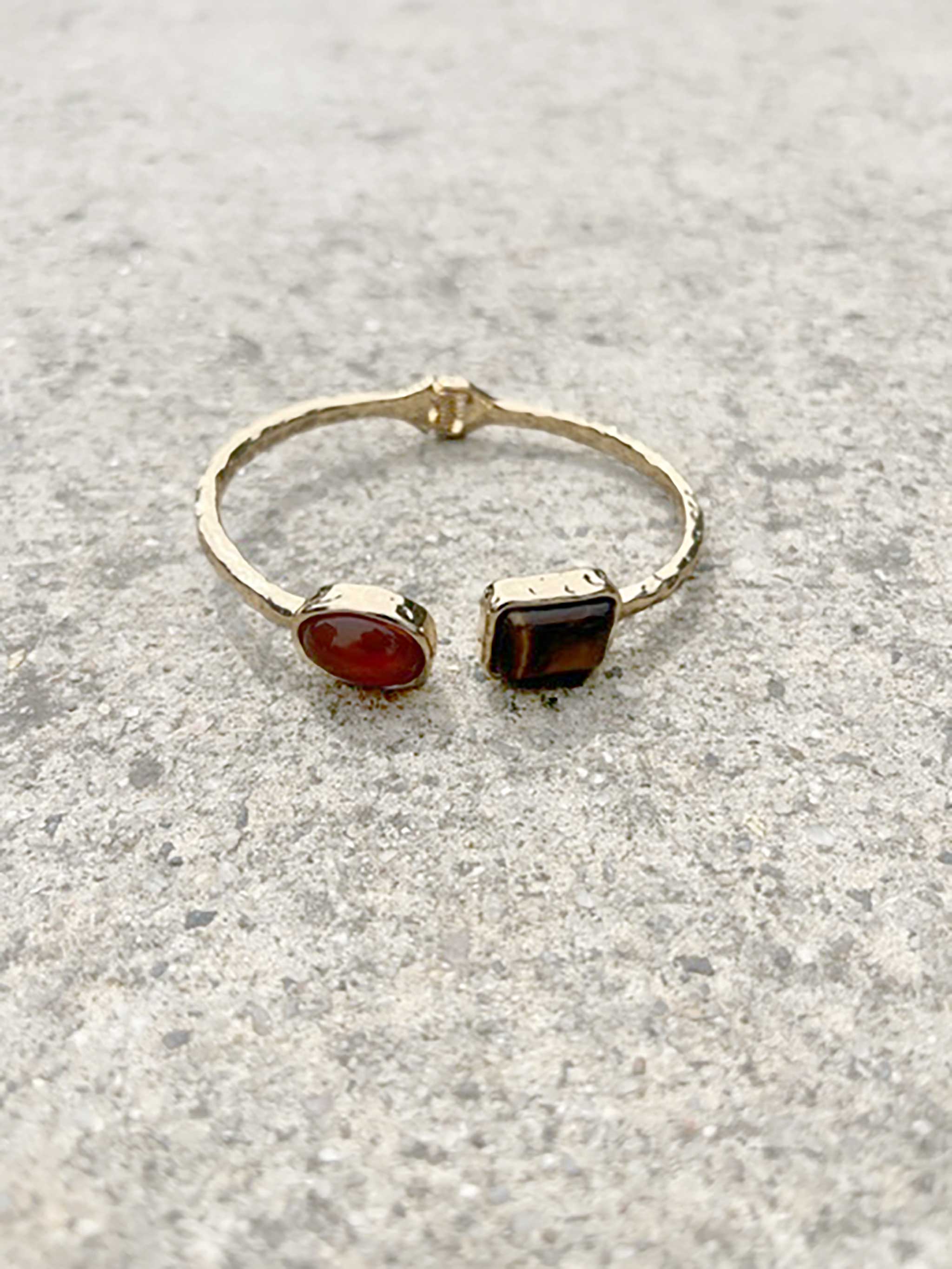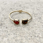 Slip into luxury with the Garnet Bracelet, a stunning gold cuff where deep garnet and mesmerising cat eye stones meet at the centre. The clever hinged design makes it effortless to slide on and off your wrist without sacrificing that elegant look.