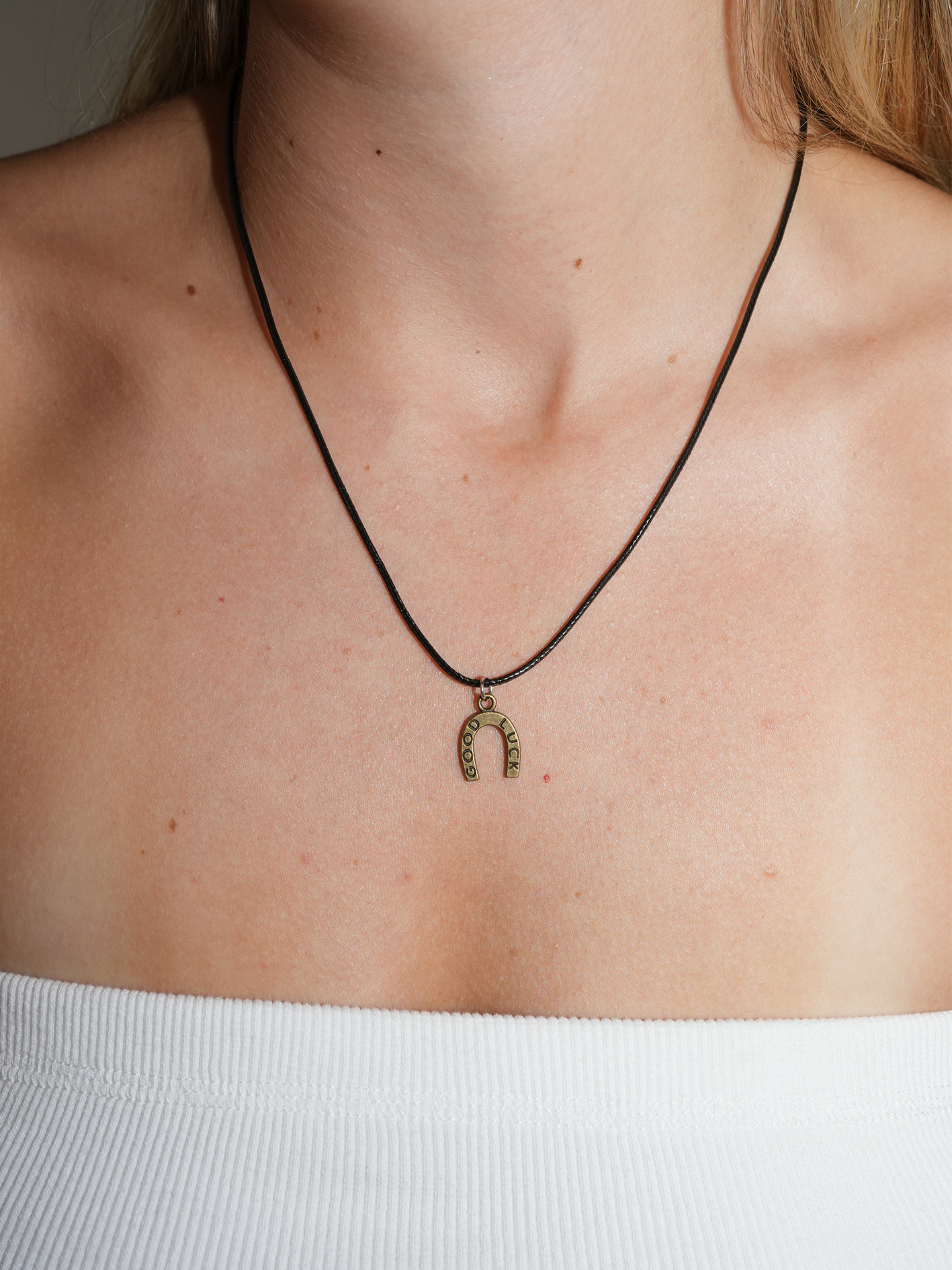 This antique gold good luck necklace is the perfect 2000s touch to your outfit! On a long rope the horseshoe can be tied to your desired length.