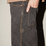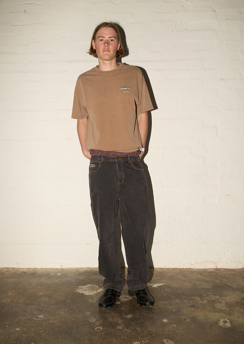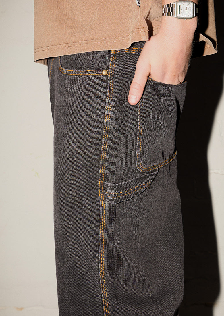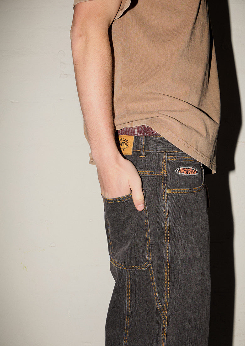 Cop our Ledger Pants in Ashphalt Black! Featuring the Khrma Blade logo embroidery, wide, baggy fit in a cool vintage wash, as well as side pockets and a hammer loop detail. Pair these with one of our white singlets for an effortless look.