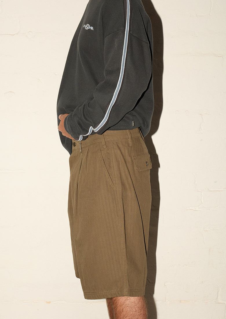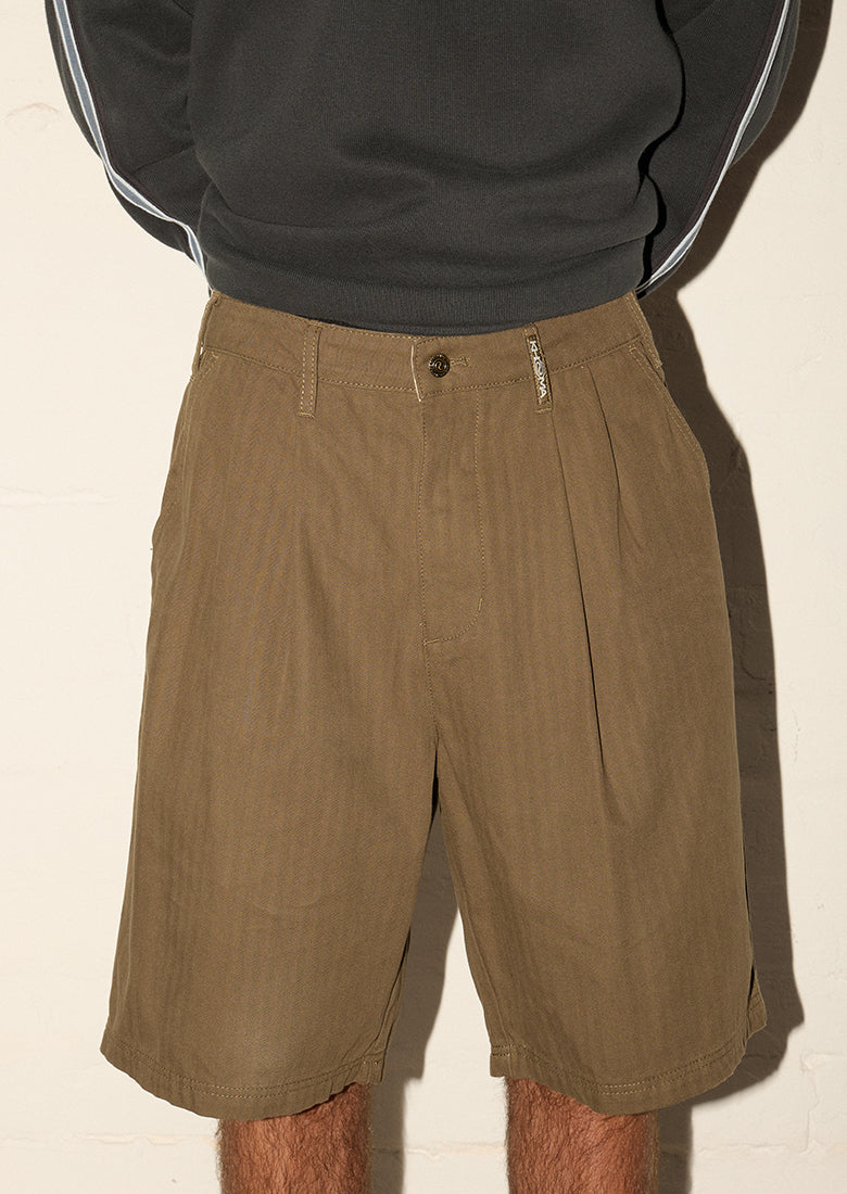 Pleated Herringbone Shorts - Martini Olive