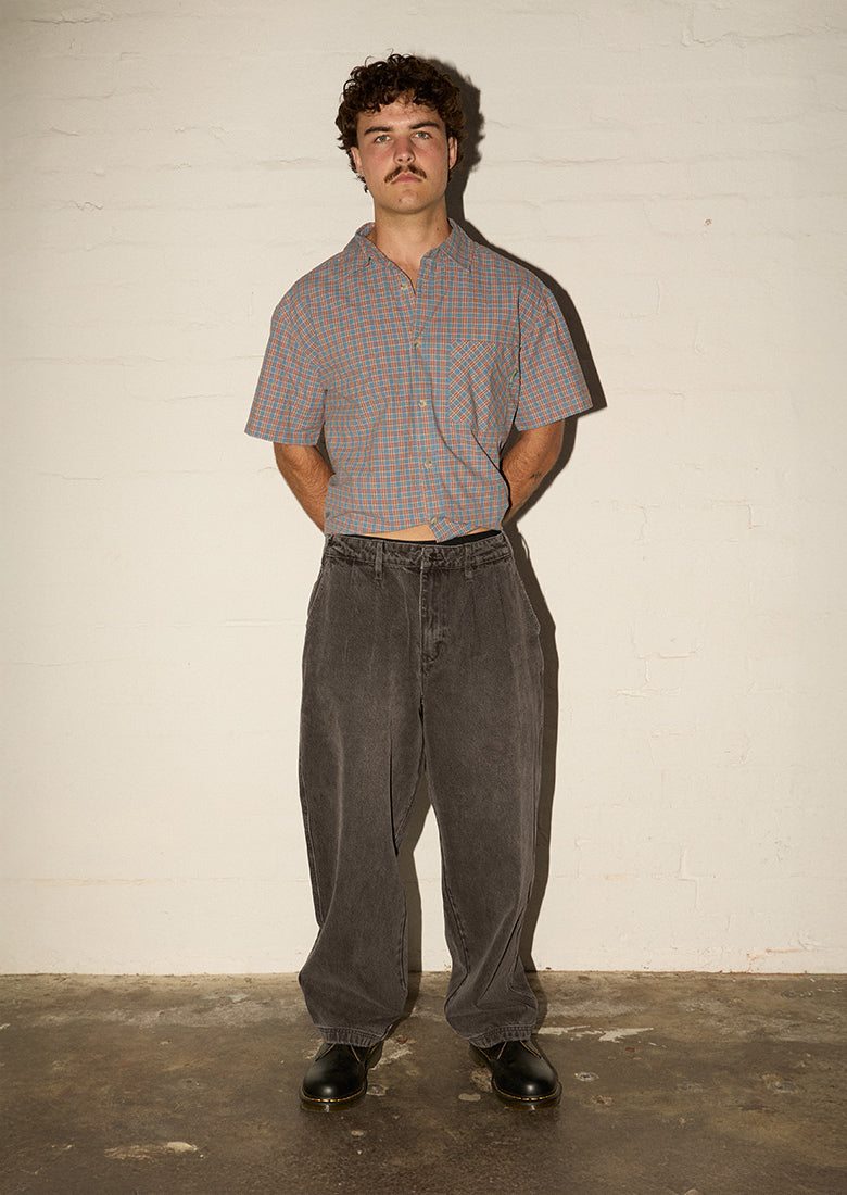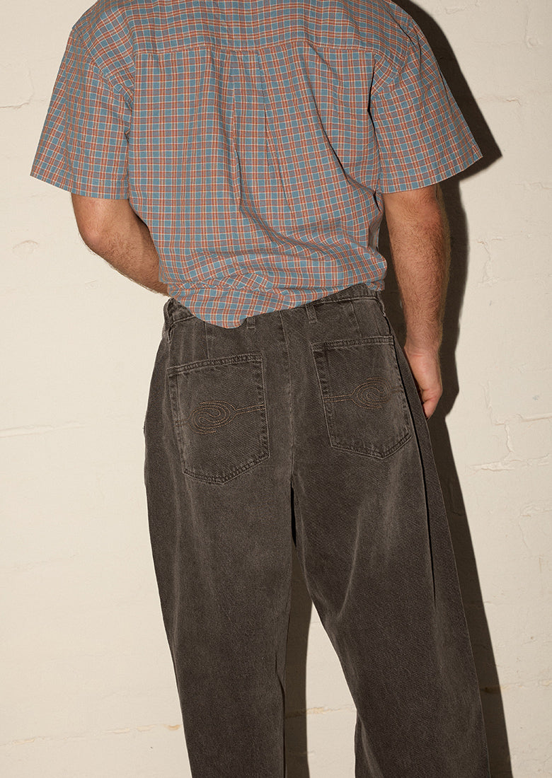 Embrace effortless edge with these vintage black pleated jeans. Relaxed fit and discrete pleating create an undeniably cool silhouette, while functional side pockets keep you practical. Embroidery detail on back pockets, and a distressed hem adds raw, rebellious character. Perfect for those who refuse to blend in.