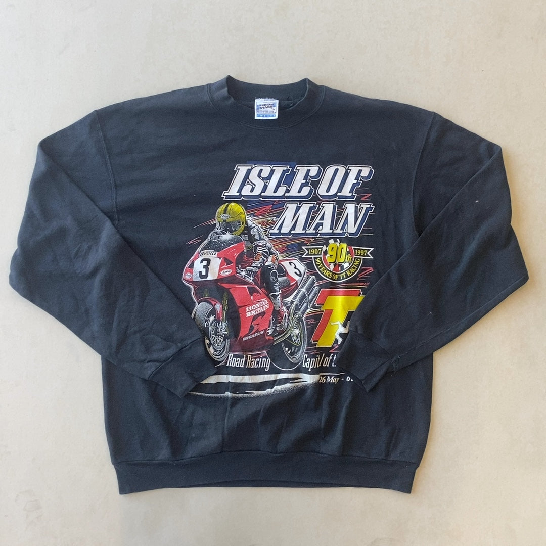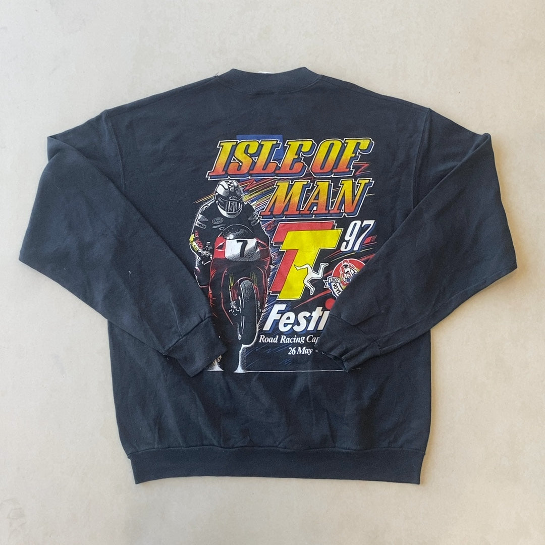 Black crewneck sweatshirt with large Isle of Man TT road racing graphics on both front and back. Front features a red Honda race bike and rider with bold “ISLE OF MAN” text and a 90th anniversary style emblem; back has oversized multicolor “ISLE OF MAN TT 97” festival graphic with rider on bike. Ribbed collar/cuffs/hem; soft fleece sweatshirt fabric.